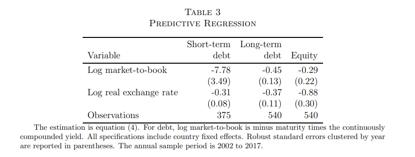 (표 해석) 위 표는 36개 국가의 단기채, 장기채 및 주식에 대한 패널 회귀분석의 결과 보고식인데, 로그 MoB비율과 실제 환율은 모든 자산군에 대한 초과 수익률의 유의미한 예측 요인으로 나타난다. 단기채의 경우, 실질 환율의 추정 계수가 -0.31으로 환율이 1% 증가할 때마다 88 bp 증가한다는 것을 나타낸다.