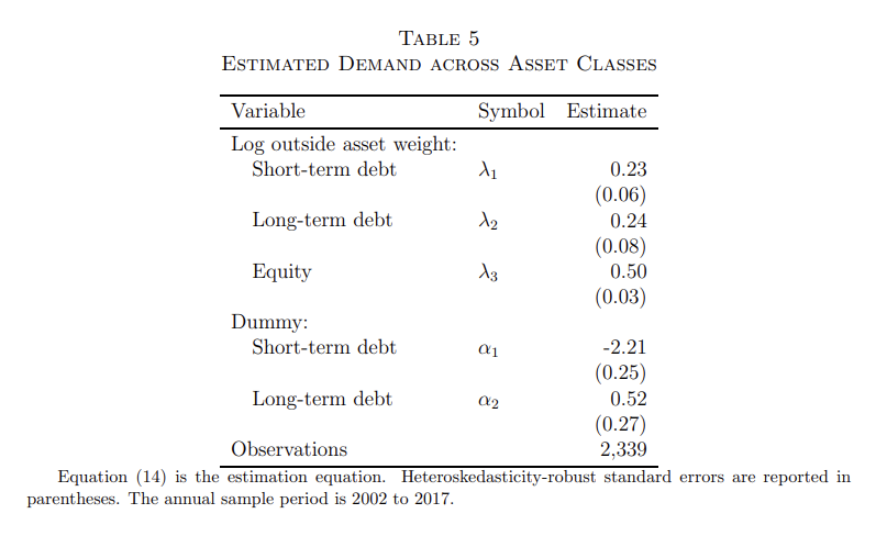 (표 해석) 자산군 내 수요에 대해서 추정된 계수를 나타내는데, 단기채의 경우 기대수익률에 대한 계수가 31.53이며 수요 탄력성 (demand elasticity)은 42이다. 이는 가격이 1% 상승할 때 단기채 수요가 42% 감소함을 의미한다. 또한 거시 변수에 대한 계수 부호 (sign)이 자산군 간에 유사함을 알 수 있다. GDP와 GDP/Capita 는 양수인데, 이는 발행국의 사이즈와 wealth 가 클수록 수요가 증가한다는 것을 의마한다. 인플레이션이 1%p 증가할 때, 장기채 수요는 22% 감소한다.
