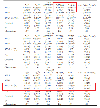 다음으로는 이런 통화정책 전달이 금융 시장에 전달되는가 살펴볼 수 있다. 정책 금리에 대한 불확실성이 자산 가격의 통화정책 충격에 대한 반응을 악화시킬 수 있는 이유 중 하나라는 점을 강조한다.