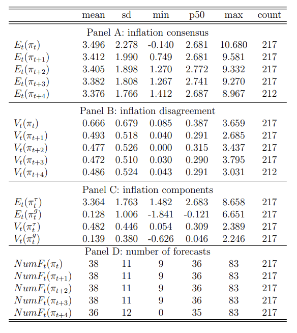 이때, 개별 예측가들의 연율화된 분기별 인플레이션 기대치로 현재 분기와 다음 네 분기에 대한 데이터를 활용한다. Variance는 이상치 (outlier)에 민감하므로, 상,하위 10%를 제거한 데이터를 사용한다.