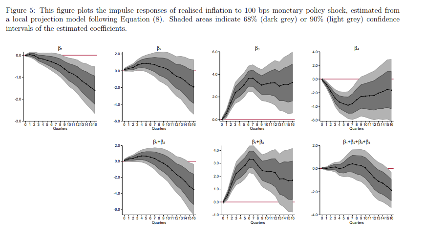 (그림 해석) $\beta_{4, h}$ 는 통화정책 충격이 한 국면에 도달했을 때, 추세 및 순환 불일치가 모두 중앙값보다 높을 때, “얼만큼의 추가적인 가격 변화를 보여주는지”를 포착하여 나타낸다. $\beta_{2, h}$는 높은 추세 불일치 + 낮은 순환 불일치일 때, “추가적인 인플레이션 변화”를 나타내며, $\beta_{1, h}$ 는 추세 및 순환 불일치가 모두 낮은 경우, 실현된 “가격 수준 변화”를 나타낸다. 이들을 조합해서 각 국면 (Regime)별로 어떻게 반응하는지 파악할 수 있다.