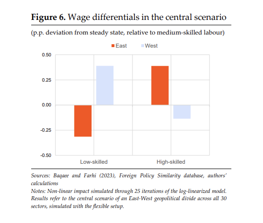 (좌측 그림) 무역 디커플링은 기술 수준 (높음, 낮음, 중간)에 따라 상대적 임금 차이 간에 재분배를 가져오기도 한다. 위 그림은 중간의 기술 수준을 가진 노동자들의 임금 변화 (evolution)을 기준으로 차이를 보여준다. West 블록에서는, 중간 기술의 노동자들 임금대비 낮은 기술 수준의 노동자 임금 증가율이 더 크다. 즉, 낮은 기술 수준을 가진 노동자가 이득을 본다. 이는 West 블록에 있는 국가들이 기존에는 낮은 기술 수준의 노동력과 투입물을 East 국가로 부터 수입했기 때문이고 해석할 수 있다. 동부에서는 이와 정 반대의 효과로 나타난다. 따라서 전반적으로 효과의 규모는 제한적이지만 재분배 효과를 가져온다고 할 수 있다.