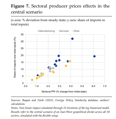 (우측 그림) 부문별 관점에서 보았을 때, 수입 중심의 제조업 부문에 대한 가격 영향이 더 크다는 점을 알 수 있다. x축에는 생산자 가격 수준, y 축에는 생산의 수입 중심성 (import‐intensity of sectoral production)을 보았을 때, 생산에서 수입 중심성이 높을 수록 생산자 가격이 올라감을 알 수 있으며, 0.8의 상관관계를 나타낸다. 즉, 수입 중심도 차이로 인한 효과를 보자면 제조업이 크다는 것이다. 평균적으로 제조업 부문은 생산자 가격이 대략 3.0% 증가하며, 서비스 부문은 약 1.8% 증가하는 모습을 보인다.