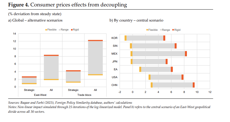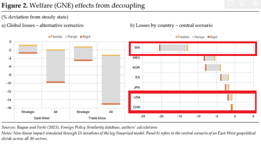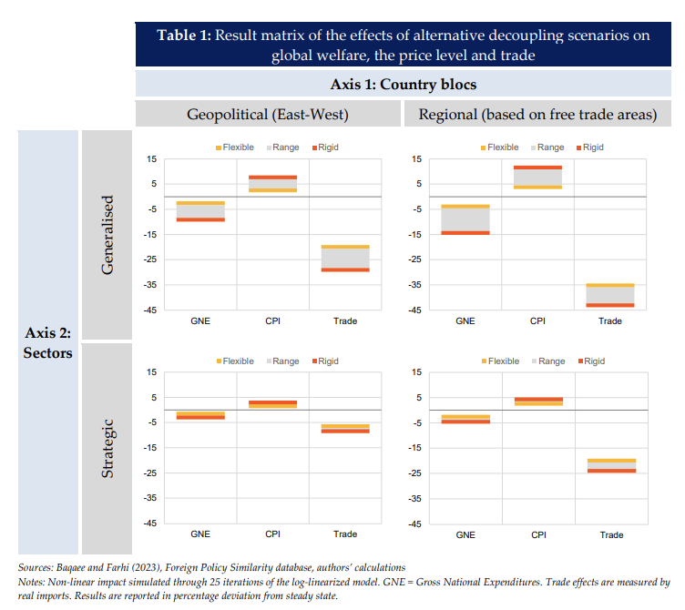 (그림 해석) 무역 디커플링은 중간재롤 포함해 최종재 등에서도 손실을 가져온다. East-West 블록으로 분리되는지, 지역 블록에 따라서 분리되는지에 따라서도 최소 6%에서 44%까지 감소하기도 한다. 최종재 무역은 무역 장벽의 직접 대상이 아님에도 불구하고 3%에서 16% 감소하기도 하는데 전체적인 수요의 감소로 인한 효과라고 볼 수 있다.