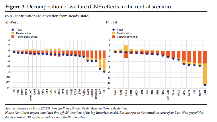 - 특히 rigidities한 부분에서 (이 모형에서는 rigidities가 있는 경우를 단기라고 보는데) 더 큰 손실을 보이는 이유는, 대체 생산 투입이 증가하면서 국내 생산이나 블록 내 무역을 통해 점차 흡수되고, 이후 장기적으로 무역 디커플링으로 인한 손실이 제한되기 때문이라고도 해석할 수 있다.