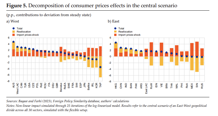 두번째, 세번째 그림에서 볼 수 있다시피 가격 상승도 이질적으로 나타난다. CPI는 모든 국가에서 rigidities 한 경우와 flexible한 경우 모두에서 큰 차이를 보이는 점을 확인할 수 있다. 국가 간에도 상당한 차이를 보이기도 한다. 이는 (1) 수입 가격 충격과 (2) 재할당 효과로 분해되어서 반영이 된다.
