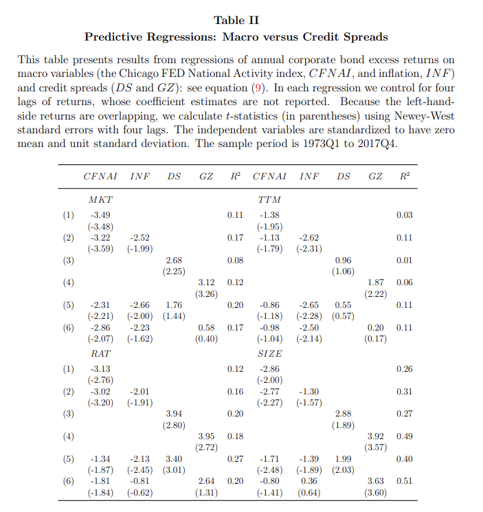 (표 해석) 이 회귀분석에서 종속변수는 연간 회사채 초과 수익률이며, CFNAI, 인플레이션, 신용스프레드 DS 와 GZ는 독립변수로 고려한다. 아래의 숫자는 계수와 (t-통계량), R-square 가 있다.