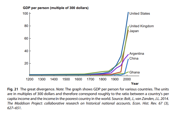 - 시간에 따른 인당 gdp의 변화를 보여주는 그림인데, 이는 1600년 이후 발생하는 소득이 점점 ‘divergence’하는 것을 가시적으로 보여준다.