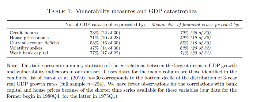 GDP 재앙 전 취약성 (지표로 측정한)이 선행한 경우의 비율 실제 GDP의 가장 심각한 감소 중 30개 중 22개 (73%)는 GDP 감소의 시작 시점으로부터 신용 붐에 의해 먼저 선행이 됨