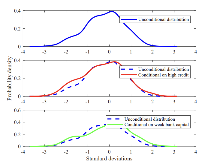 - credit-to GDP 성장이 12분기 전에 국가별 평균을 초과한다는 조건 하에 실제 GDP 성장의 분포의 확률 질량이 더 왼쪽 꼬리로 이동