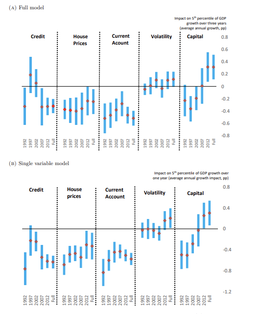 - (영국; 상단 그래프) 1990-1991년의 불황 전에 신용과 주택 가격의 급격한 상승, 확장되는 흑자와 긴축 통화 기조(1988년 5월의 7%에서 1989년 10월에 거의 15%로 상승한 금리)로 인해 GDP-at-Risk 수준이 매우 높았다. 초반에는 성장 리스크가 억제되어 있다가 2000년 중반 이후 신용과 주택 가격의 빠른 상승이 재개되면서 은행 자본 적정성이 약해지고 성장 꼬리 위험이 크게 증가했다. 2006년 리만 파산을 2년 앞둔 시점에서 모델의 결과는, 이후 3년 동안 GDP-at-Risk가 연간 -1.3%에 달할 것으로 예측
