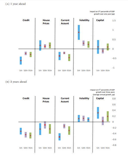 1년, 3년 앞선 예측 분포 차이 + GDP 성장 예측 분포의 꼬리를 다른 quantile과 비교 (위의 그림) 1년 후에는 신용 증가 (current; 1번째)와 변동성(volatility; 4번째)의 innovation이 중앙값이나 95번째 백분위수보다 5번째 백분위수에 더 큰 영향 (즉 비대칭적으로 나타남)