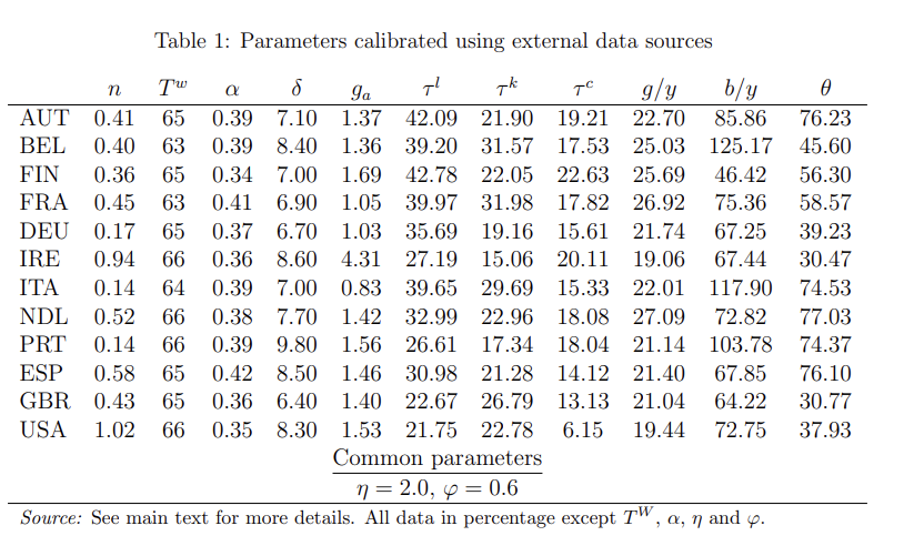- 연금 대체율 (Pension replacement rates) $\theta$은 OECD (2021)에서 얻은 평균 남성의 평균 소득을 기반으로 2014년, 2018년 및 2020년의 평균 연금 대체율
