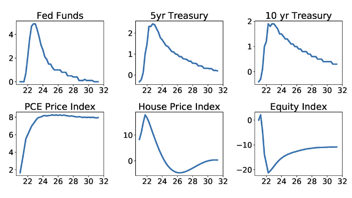 이자율은 예상대로 상승하는 모습을 보이고 있고, 인플레이션도 높게 유지되고 있다. 주택 가격지수는 높아졌지만 장기적으로는 거의 변화가 없고, 주식 가격은 예상보다 크게 하락한 모습을 살펴볼 수 있다.