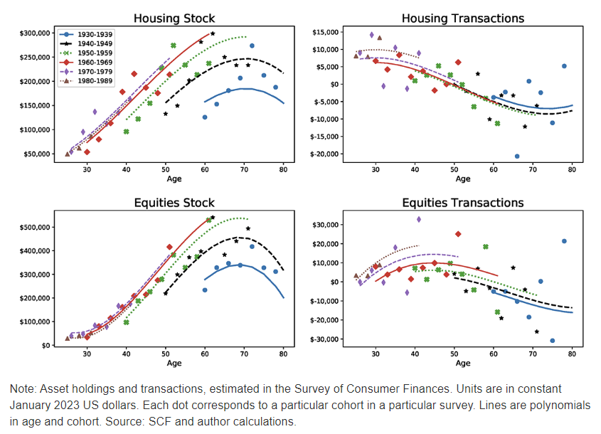 [그림 해석] 주택(housing)과 주식(equities)에 대한 각 코호트의 수명 주기 동안 평균 보유량 및 평균 연간 거래